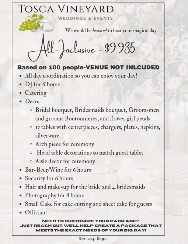 Enjoy the unique experience of strolling through the lush vineyards of Tosca Vineyard in Conroe, Texas and selecting a vine to become dedicated to your Wedding Day.